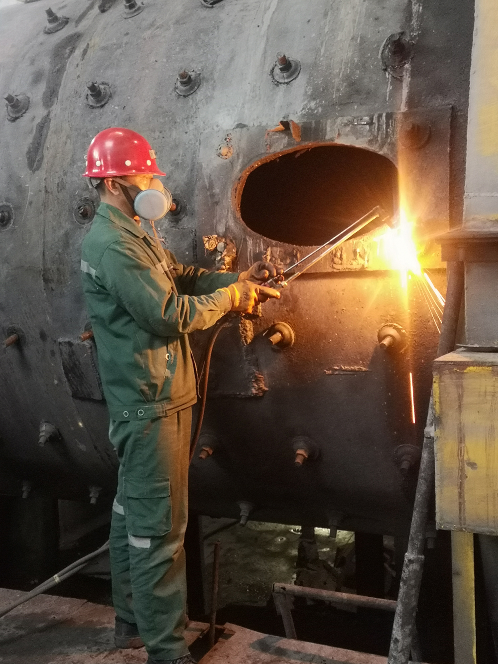 4月6日上午8時,按照計劃安排球磨機鋼球已經全部倒出,白班進行舊襯板拆除工作。同時,磨選車間充分利用本次檢修機會,同步工藝停機,對10#球磨機鼓式給料器進行更換、對11#球磨機出料端端蓋進行檢查補焊、對8#球磨機小齒輪軸承座北側螺栓進行更換。